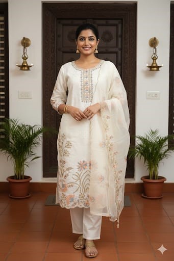 Style.straight kurta, straight pant, printed tissue dupatta with golden border.